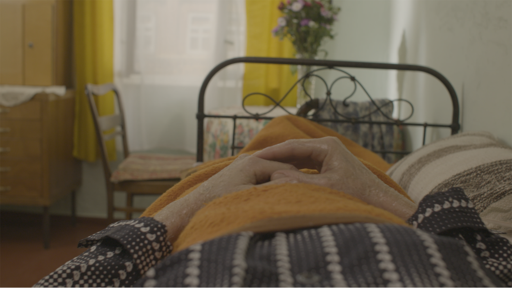 The film approaches the physical process of going blind from a personal perspective. The audience perceives the world of the protagonist from her eyes, with all the signs of wear to which she is subject in the process of the film. The camera image blinks like the human eye, gradually spots appear on the lens, more and more information disappears from the image, and in the end it is almost black. The audio level of the film also corresponds to the protagonist’s auditory perception. They help her, and thus also the audience, to assign the changed images to a reality. Through the open window the protagonist perceives typical sounds of the four seasons, thereby the film is divided into four scenes. We get information about the country in which the protagonist lives through screaming children playing in the courtyard or short conservations between the protagonist and visitors. By a commentary in the television we learn about armed conflicts in the Caucasus, at which point the protagonist only perceives light-dark contrasts. Because of the change of geopolitical situation, the protagonist has to leave her place of residence in the North Caucasus (Russia) and move to the South Caucasus (Georgia). As a result of the change of location, almost blind at the new place of residence, the traces of her old home are clearer in the eyes than the visual perception of the new place of residence. Real visual impulses come into conflict with the remembered images of the old home. The memory of the painting “Morning in the pine forest” particularly evident. The audio and video tracks no longer match, and there is a mixture of poorly recognizable reality and clearly visible illusion.